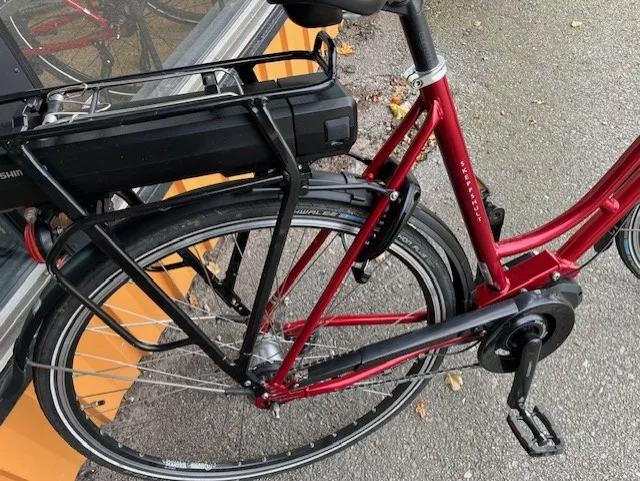 Skeppshult Nova El i färgen röd metallic. Shimano Steps 6100 motor/batteri 418Wh batteri. 7 växlar Shimano Nexus med fotbroms/rullbroms. Cykeln är i mycket bra skick. 4 nycklar medföljer och passar både cykelns och batteriets lås. Regelbundet servad.