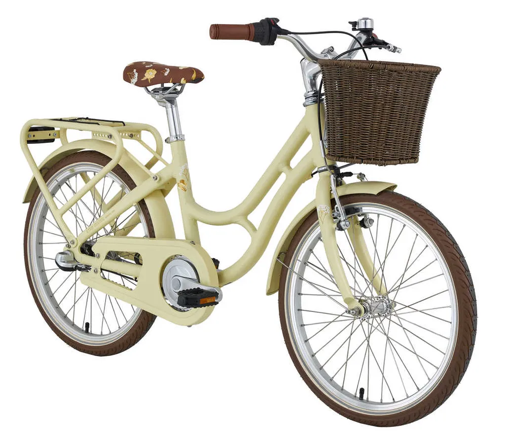 Aluminiumramen har ett lågt insteg och de lagom breda bruna däcken ger enkel hantering och god komfort. Fram sitter en, unik för cykeln, designad framkorg i rotting stil som matchar perfekt de av naturen inspirerade blomsterdetaljerna i den ljusgula lacken. Skärmar och gaffel är lackerade i samma ton, vilket ger en fin helhet.