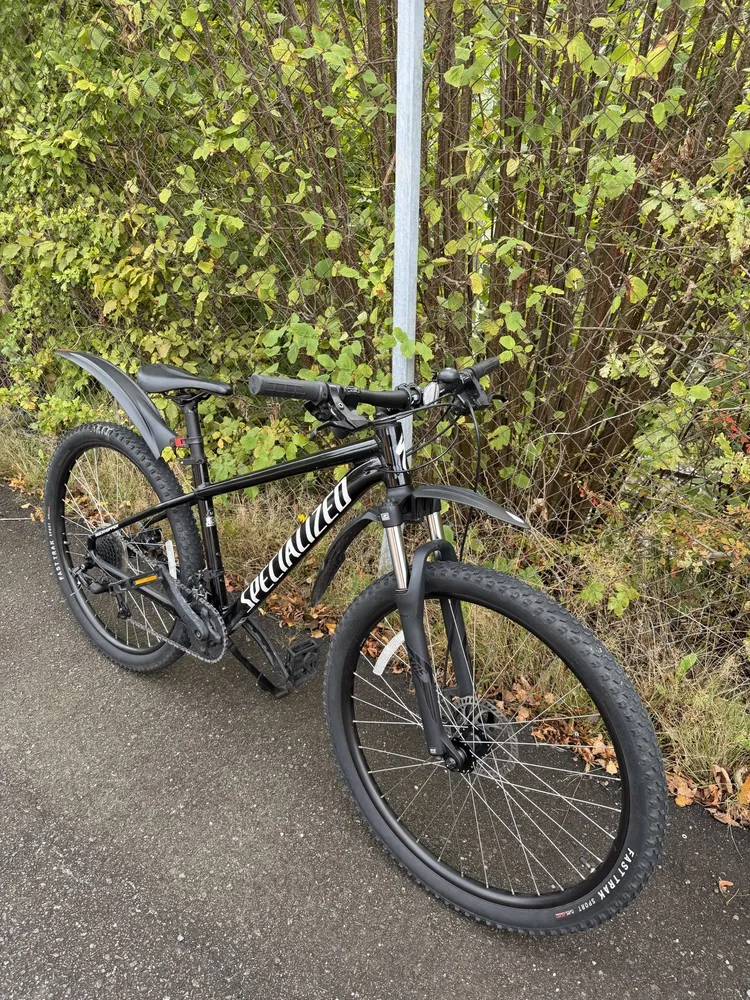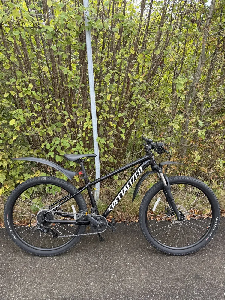 Begagnad Specialized mountainbike 27" hjulstorlek, ramstorlek M. Svart med vit text. En ägare, mycket bra skick! (finns någon mindre lackskada såklart). Mekaniska skivbromsar och Microshift 2*8 växlar. Extrautrustad med stöd och skärmar.